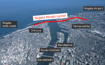 The Niigata west port is one of the largest sea ports opened to the Sea of Japan located at the river mouth of the Shinano River, however, there was no road connecting right and left bank that may enable smoother harbor distribution and transportation. This issue was considered to be the obstacle for years to Niigata to step forward to further development and for dairy life of regional habitants. In such circumstance, the action to build up connection route was looked forward strongly from the year 1919, and now longtime dream of the habitants comes true at last. The "Niigata Minato tunnel" crossing the Shinano River is completed. The whole route was opened in July, 2005 in the same time with the seaside road opening that improved greatly the traffic convenience between east and west bank areas of the Shinano River. Also access to Niigata west coast area was improved where sandy beach restoration work is now advanced.