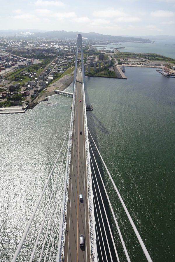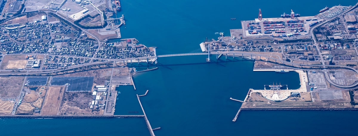 Harbor side line “Toyama new port East-West line" was built in the Harbor facility furnishing plan 1986 as harbor side road connecting east and west port areas where were divided into parts along with the opening of Toyama New Port based on the fundamental policy of traffic-distribution reformation of the divided area, comprehensive function reorganization of Fushiki-Toyama 3 ports (Fushiki port, Toyama New port and Toyama port) and activation of the ports as passenger transportation and cargo distribution harbor.