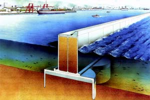 For this solution, aiming at more saving of construction cost, we developed a suction foundation as a new base that supports a huge port structure.