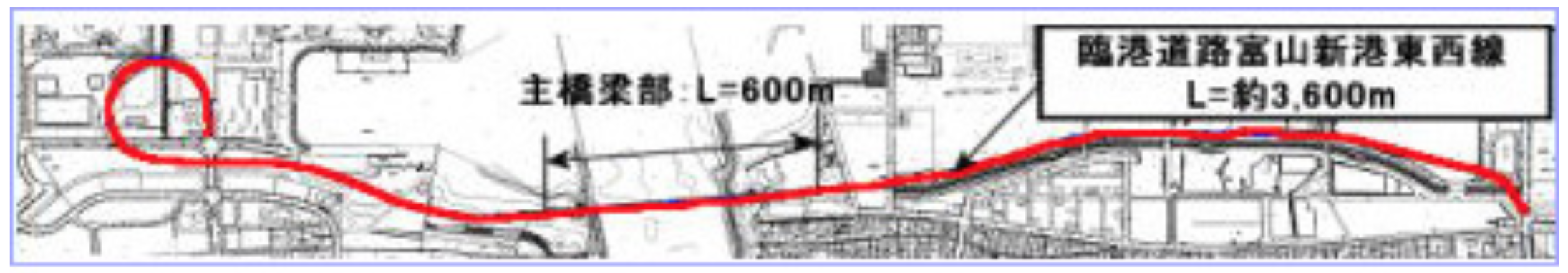 臨港道路富山新港東西線は、富山新港開港に伴って分断された湾岸部の交通・物流の復活と、総合的な伏木富山港3港(伏木港、富山新港、富山港)の機能分担、物流港湾としての機能を十分に発揮させる等の基本方針に基づいて、現在分断されている富山新港港口部を結ぶ臨港道路として昭和61年港湾計画に位置付けられました。