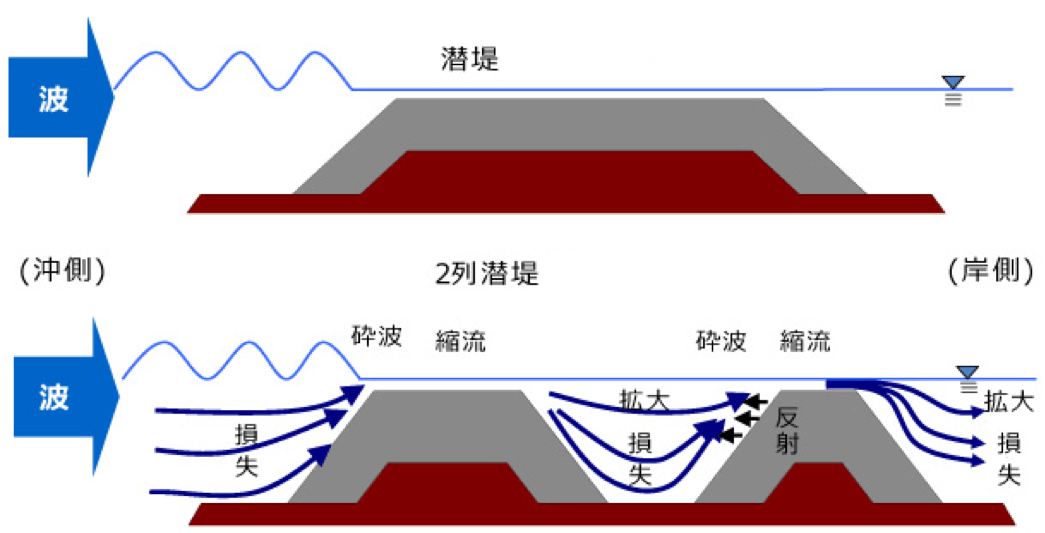 急激に波を減衰させる潜堤よりも波浪の減衰効果は落ちるが、この図の様に、沖側潜堤・岸側潜堤へと段階的に砕波・縮流・損失が起きることで、水位上昇を相対的に小さくするということを期待。