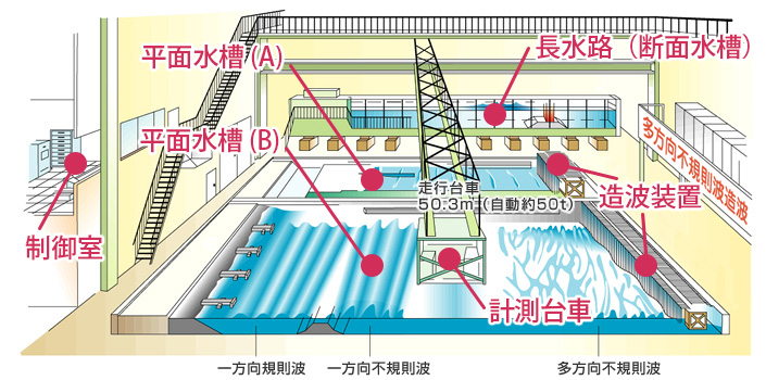当事務所の実験場は日本でも最大級の水理実験施設であり、広範囲を三次元的に再現できる平面水槽が二つ(大きい方の平面水槽は25mプール約6個分の広さ)と、設置した模型を横から二次元的に観察できる長水路(断面水槽)とがあります。建物内の面積は約4000m² あり、大きな水槽があるため中央部には柱が1本もありません。