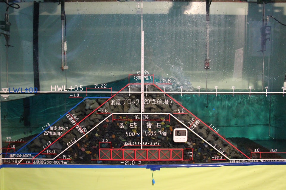 防波堤や各種ブロックが波に対してどのような挙動を起こすのかを観察・計測をして、構造物の安定性を検証します。 また、多様化する要求性能に対して、防波堤の新たな構造形式の開発にも使用しています。